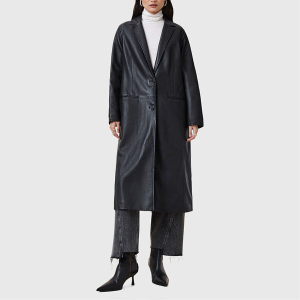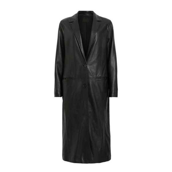 The Neu Hide Aire Leather Coat — crafted from 100% soft sheep nappa leather in a longline, single-breasted design with slim sleeves and recycled lining for a refined modern look.