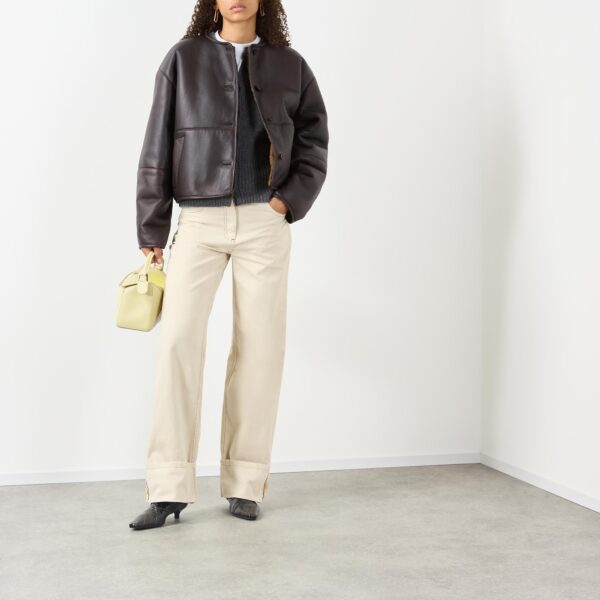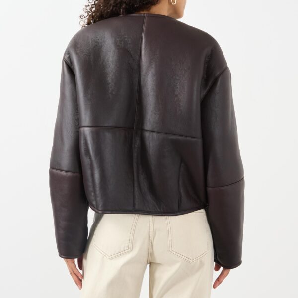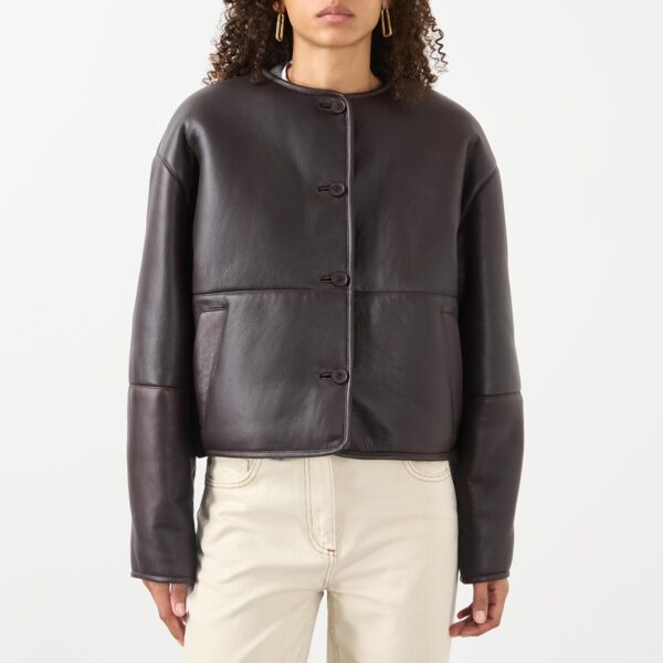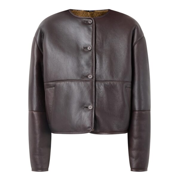 Brown sheep leather jacket with a round neckline, button fastening, piped front pockets, and subtle darting details for a bubble effect. Fleece-lined for comfort and warmth.