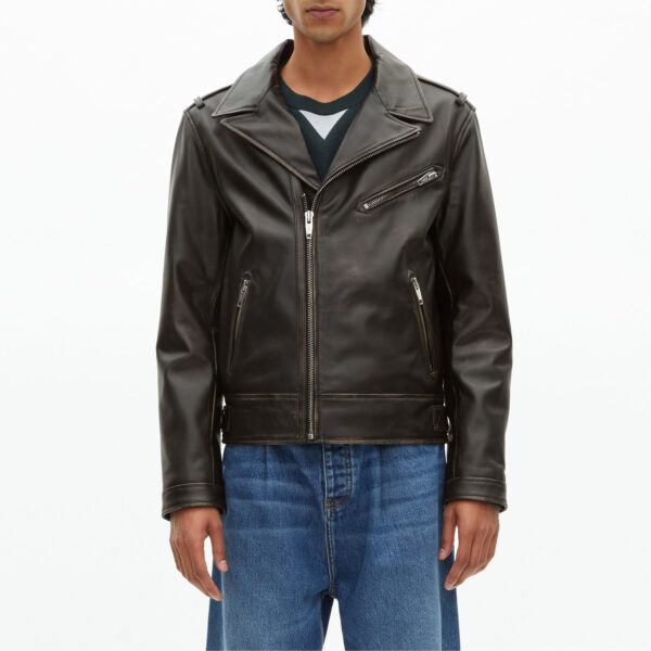 Crafted from 100% sheep leather with a vintage-effect finish, this jacket features a straight cut and notched collar for a timeless look. Designed with shoulder tabs, an off-centre zip fastening, long sleeves with zipped cuffs, and multiple pockets including a zipped chest pocket and zipped side pockets. Adjustable waist tabs complete the silhouette. Fully lined with polyester for comfort.