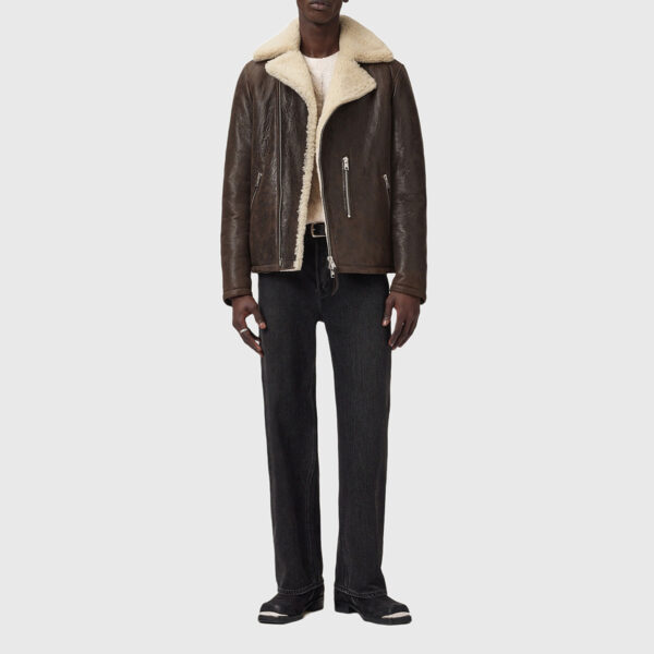 Crafted from 100% genuine sheep leather, the Neu Hide Xyler Shearling Biker Jacket embodies rugged sophistication with a modern edge. Designed in a relaxed fit, it features a shearling collar and lapel, asymmetric front zip fastening, and angled zipped pockets.